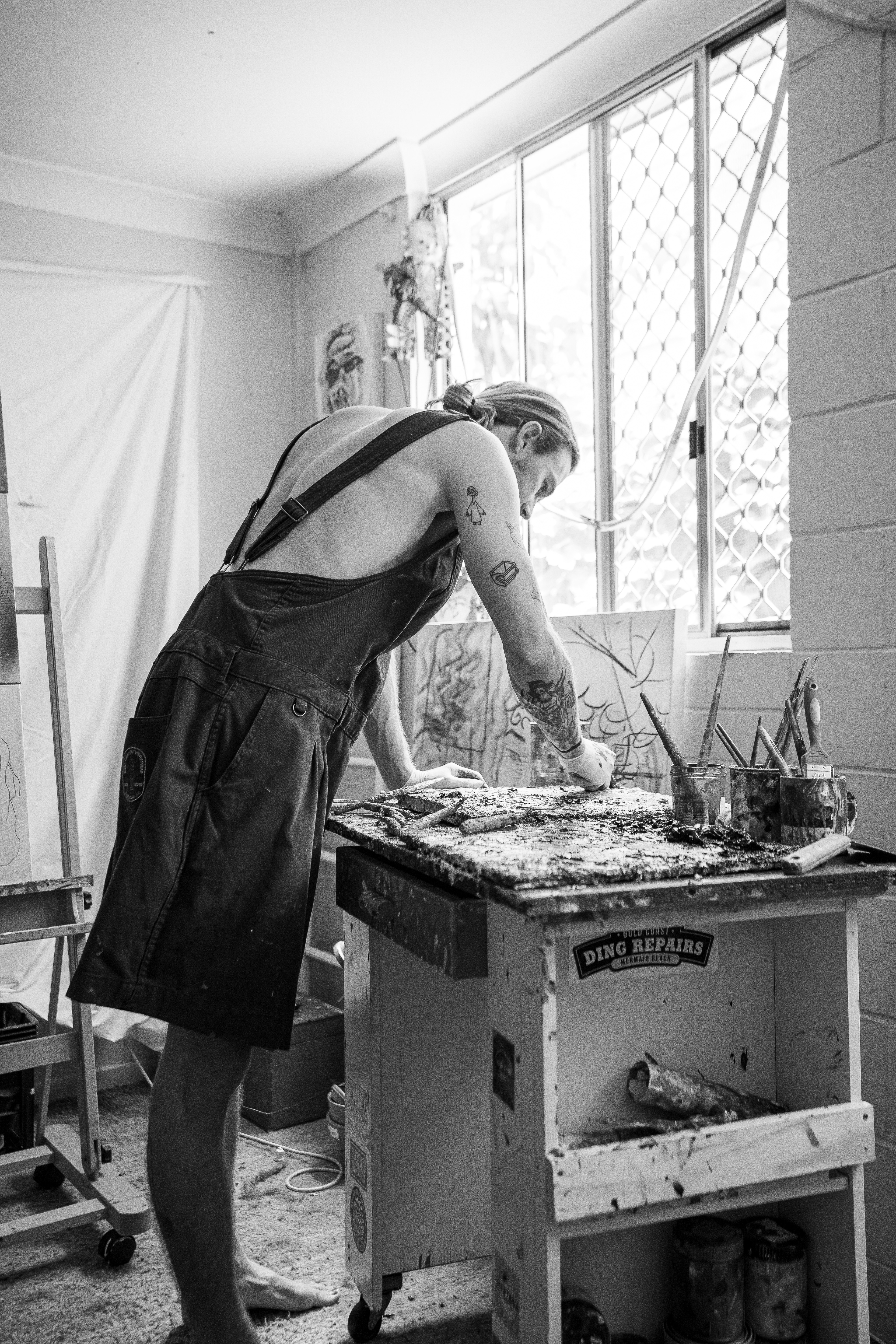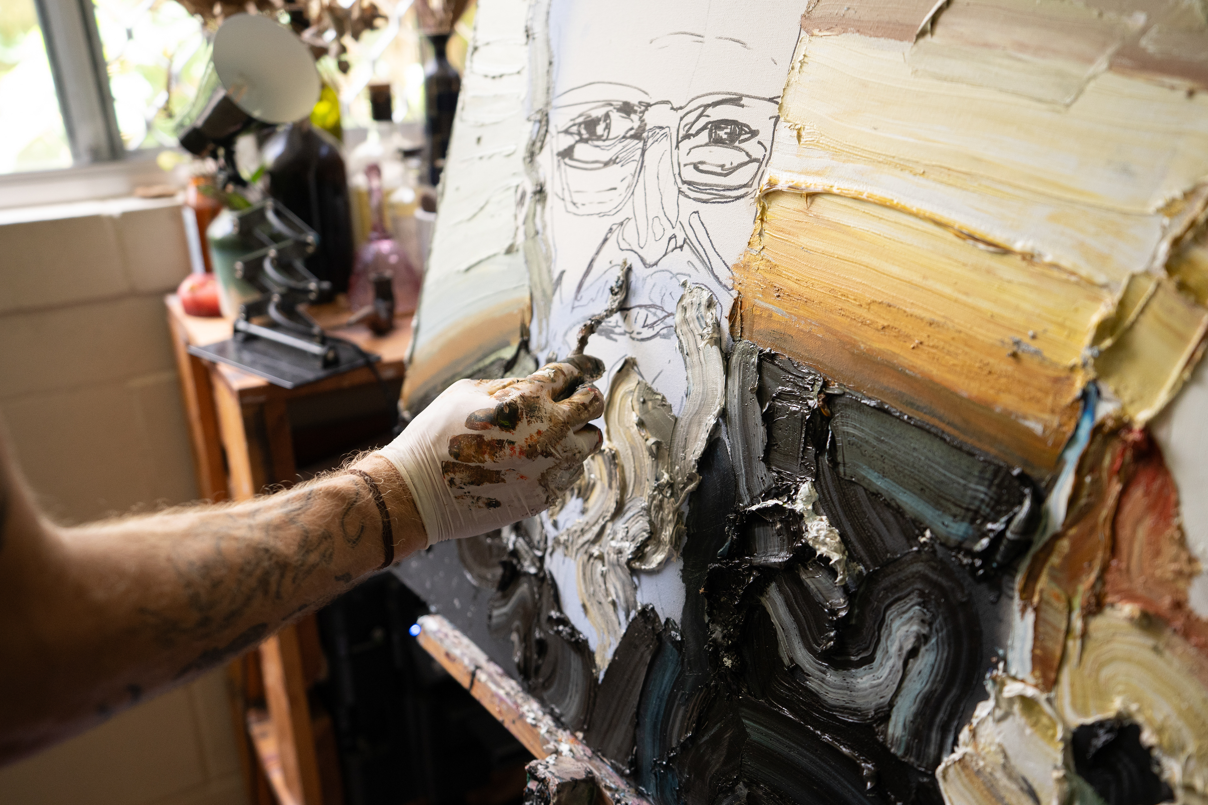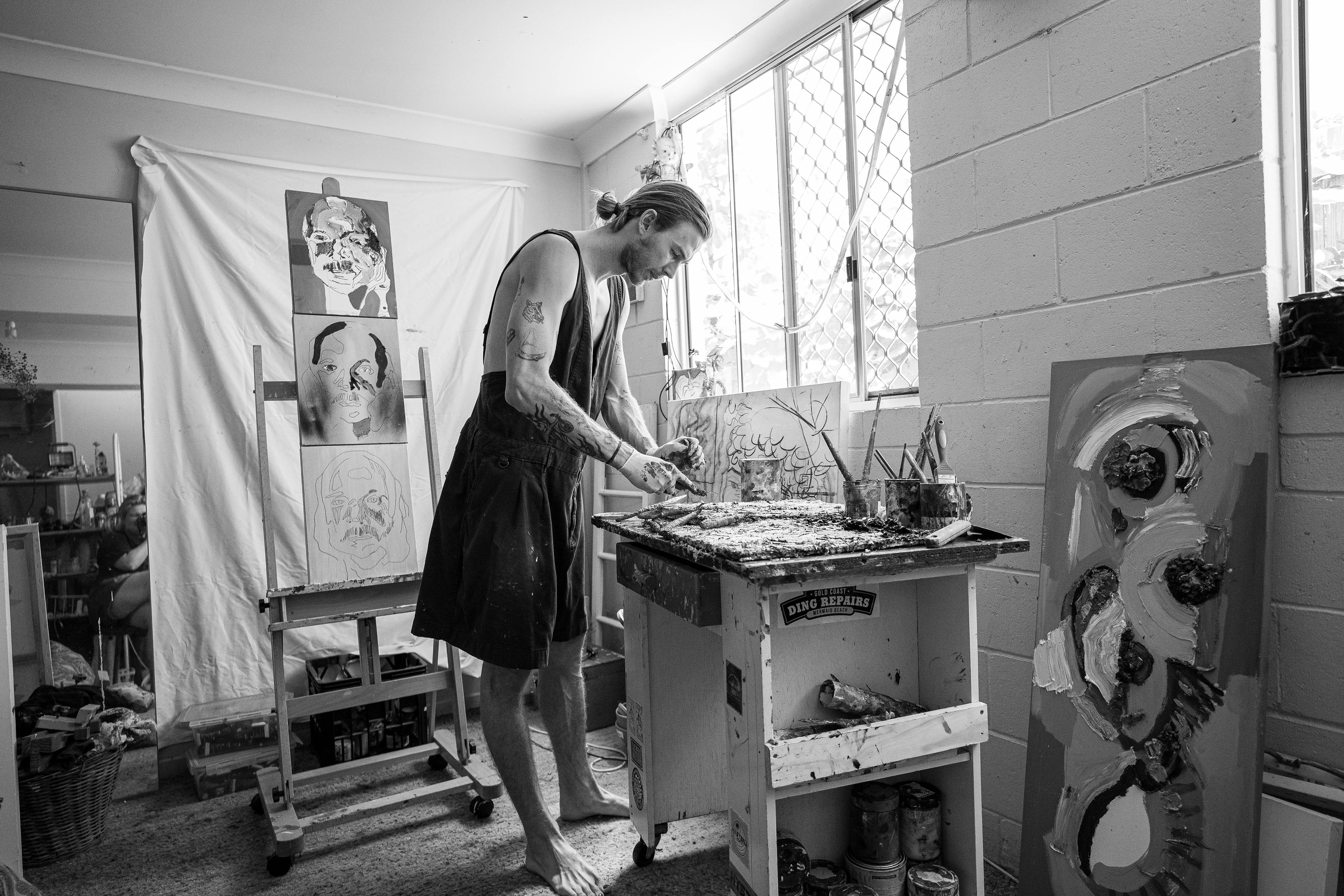 Zaide Harker painting a commission in his home studio, West End, Australia. December 2022.
